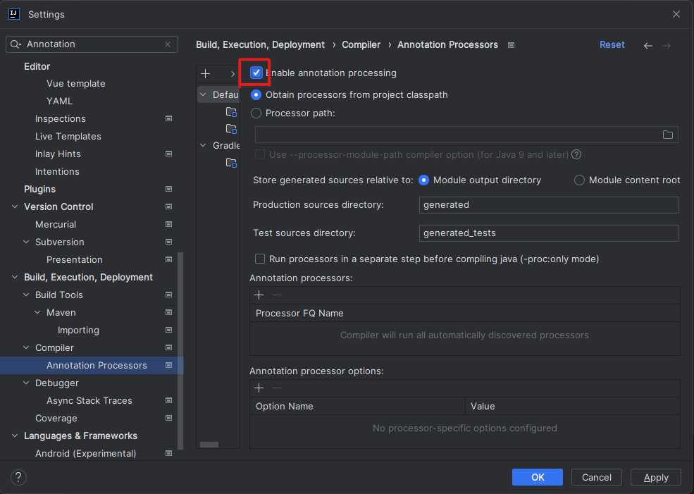 - Lombok을 사용하기 위해 Annotation Processors를 활성화 시켜줍니다.