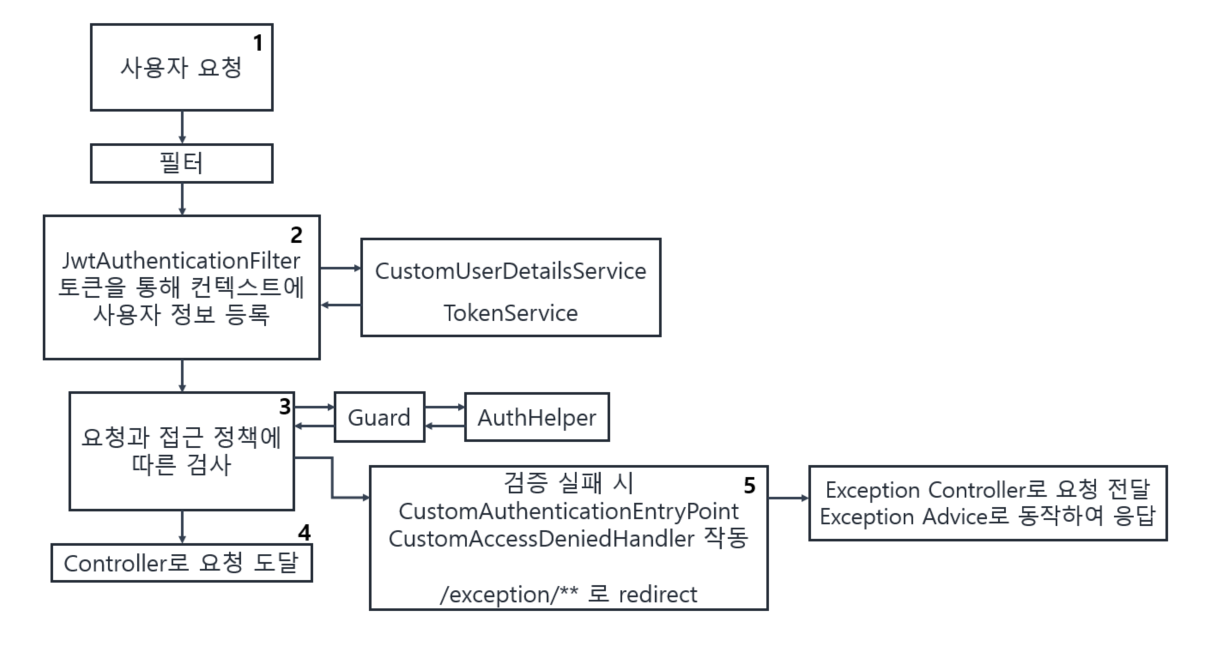 검증 작업 이전에 사용자의 인증 정보는 Spring Security에서 관리해주는 컨텍스트에 저장됩니다. 저장은 JwtAuthenticationFilter에서 진행 됩니다.