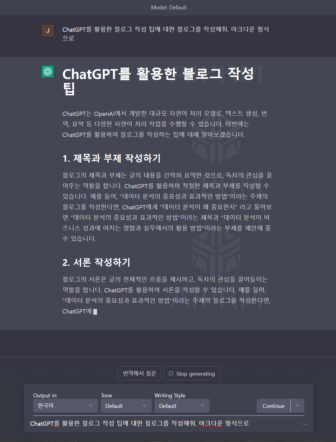 말 그대로 블로그를 작성해 달라고 요청하면 알아서 블로그 작성을 해줍니다. 이전 게시글에서 말씀드린 것처럼 구체적일수록 좋으며 요러가지 조건을 넣어주세요. 저는 마크다운 형식으로 써달라는 하나의 조건을 추가한 것만으로 진짜 블로그처럼 작성이 되는 것을 볼 수 있었습니다.