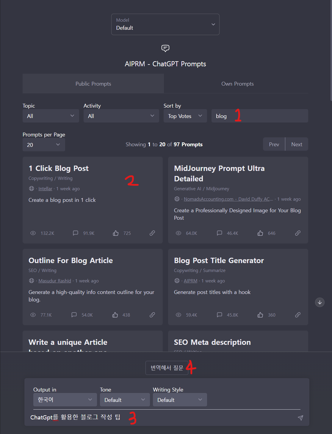 - blog를 입력 후에 나오는 여러 Prompt들중에 마음에 드는 것을 고릅니다.(저는 1 Click Blog Post를 선택했습니다.)