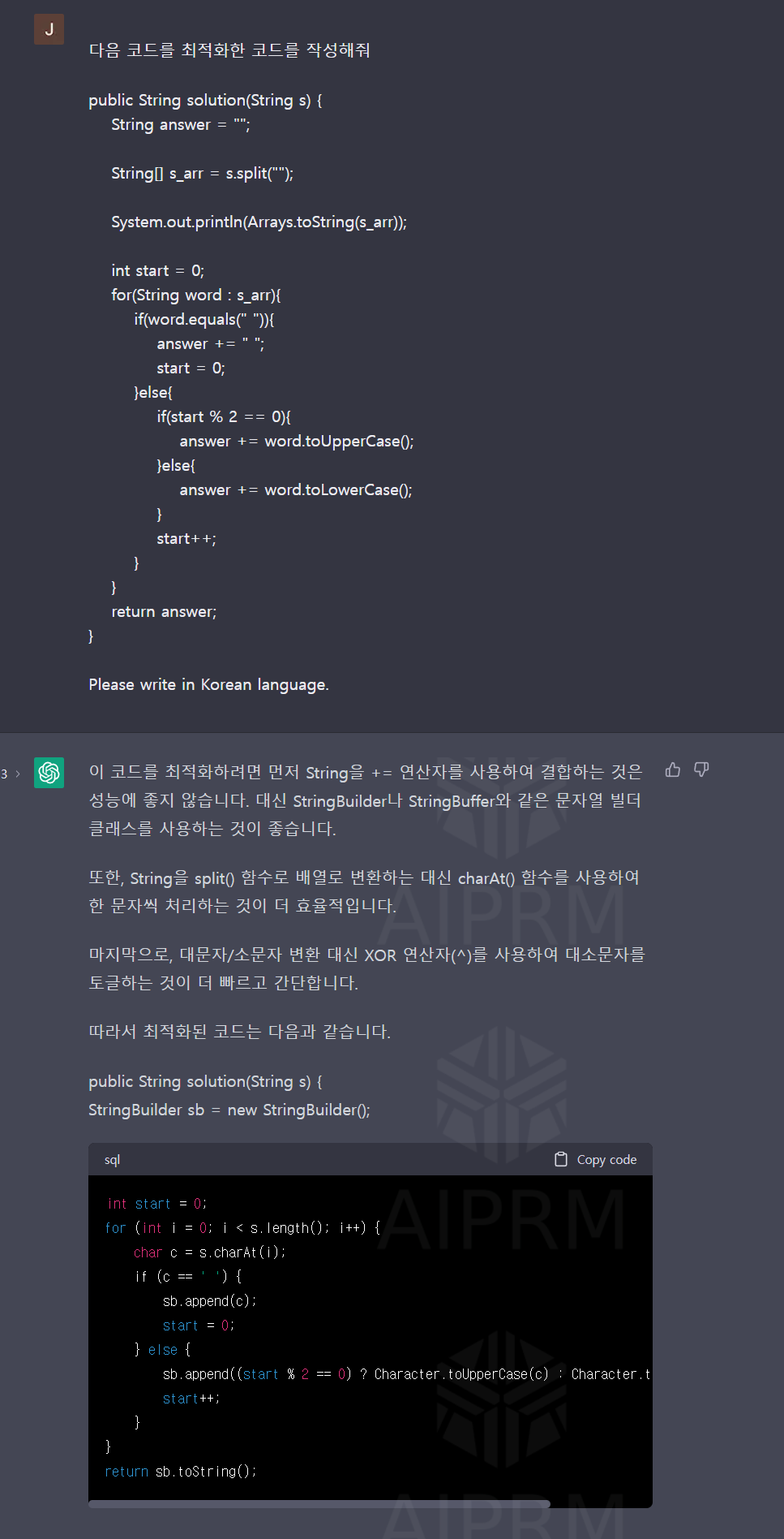 이럴 때 역시 간단하게 해결할 수 있습니다. 내가 푼 코드를 전체 복사해서 ChatGPT 프롬프트 창에 넣고 최적화 해달라고 합니다.