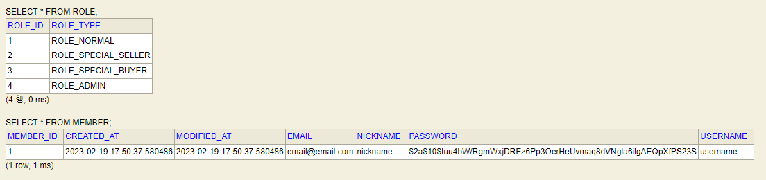 테스트까지 완료하였으니 이번에는 Postman를 활용하여 API를 테스트를 진행해보겠습니다. 현재상태로 어플리케이션을 실행시키면 role에 등급이 저장되어 있지 않기때문에 정상적으로 api를 호출할 수 없습니다. 그래서 DB에 Role 관련 데이터들을 저장해주고, ROLE_NORMAL 권한 등급을 조회해서 회원가입시에 사용자에게 부여해주어야 합니다. 일단은 클래스를 하나 생성하여 실행과 동시에 데이터베이스에 값을 넣어주도록 하겠습니다.